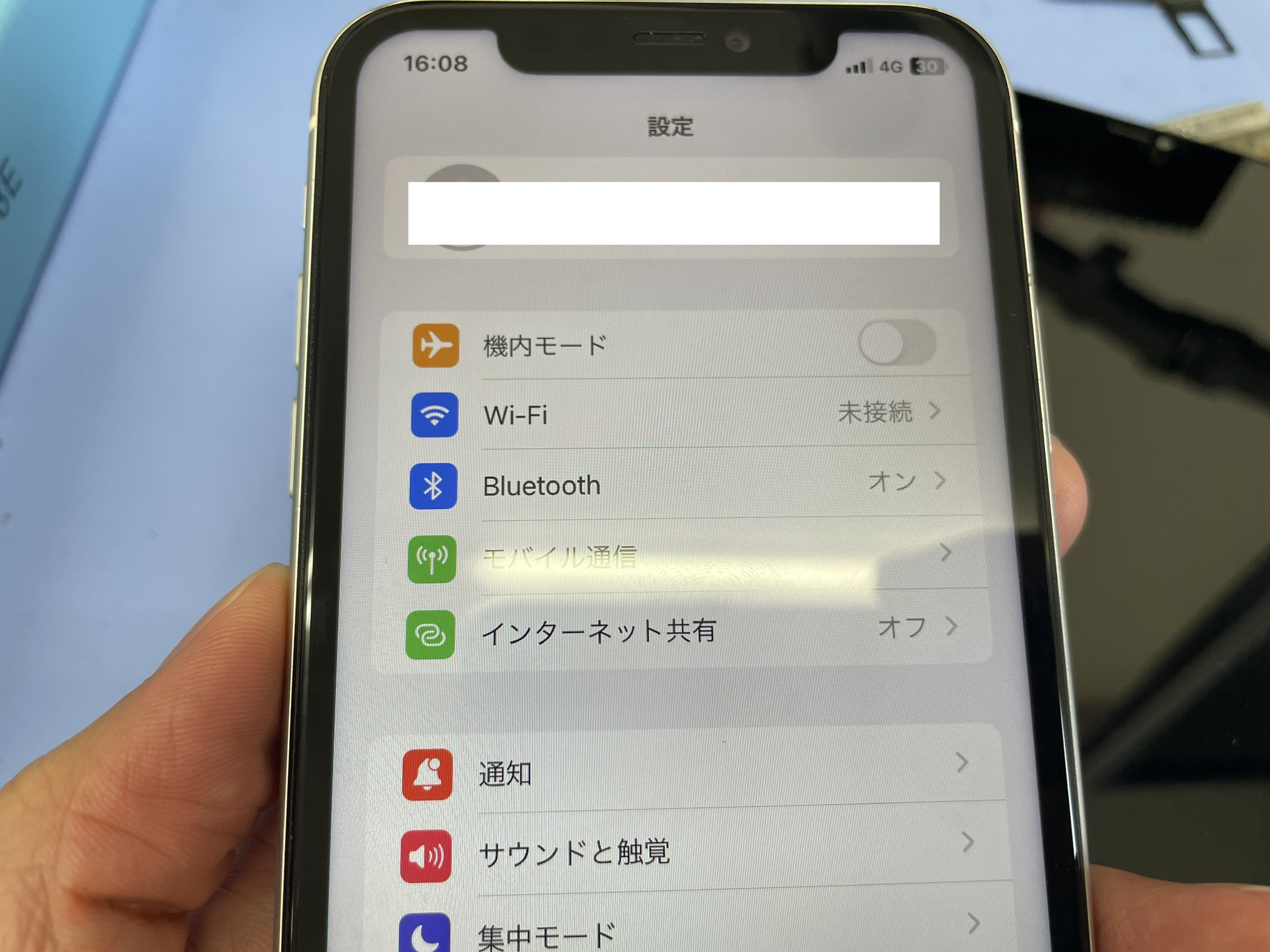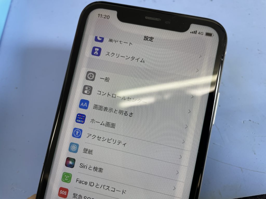 通常こちらのiPhone11からは当店のような正規メーカー以外で画面など一部パーツの交換を行うと設定内にパーツが交換されている旨のメッセージが表示されるようになります。
