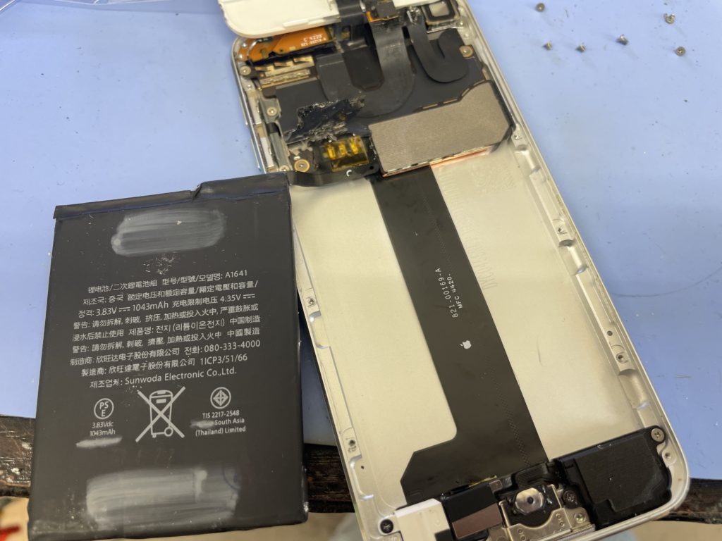 分解し確認するとバッテリーの固定がされておらず内部でバッテリーがカタカタと動いてしまう状態で前回の店舗での修理不備によりバッテリーが損傷しておりました。