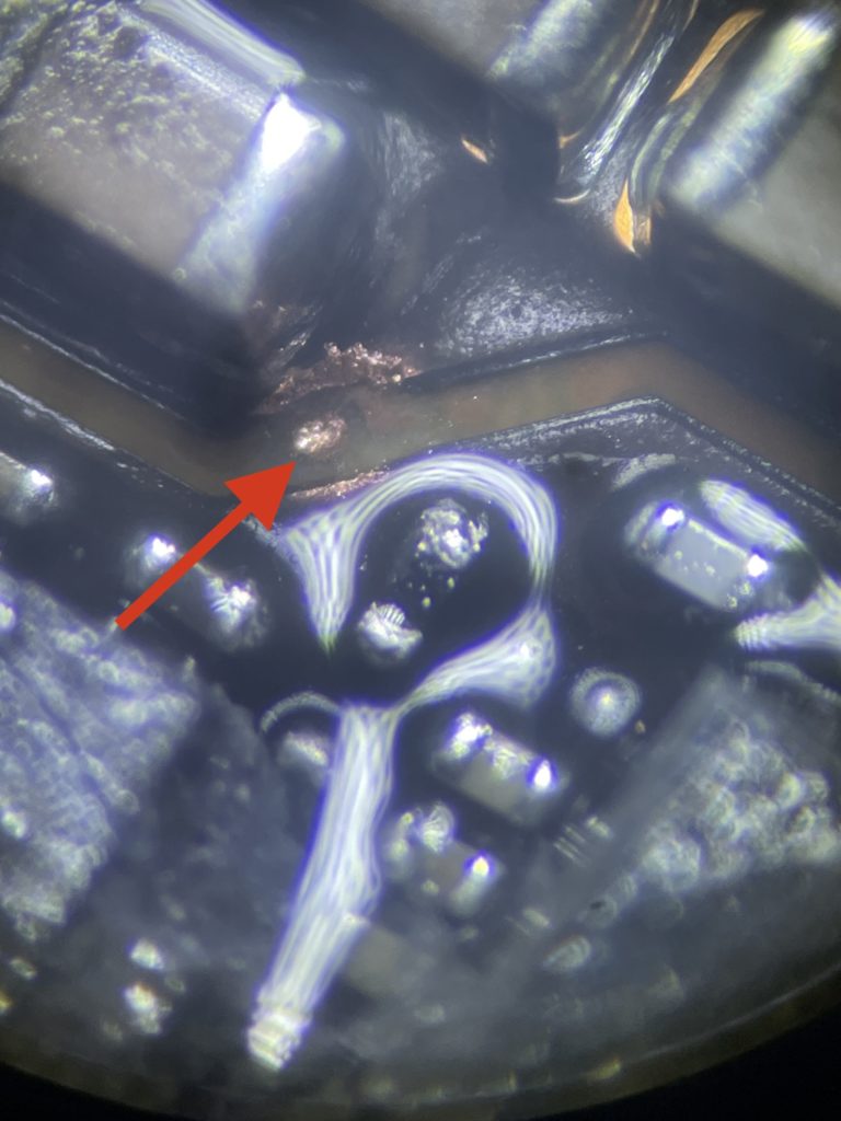 今回断線しているタッチ回路の一部はメインICであるCPUに直接繋がっている為、基板を一部削り内部の回路を露出させその1点から0.1ミリの細いワイヤーで繋合わせるという非常に繊細で難しい作業となります。