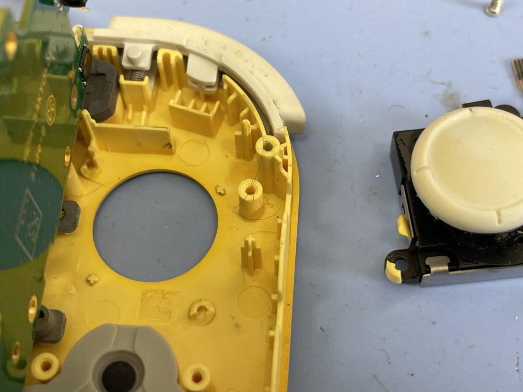 分解してみるとスティックを固定するネジ受けが割れて破損しておりネジが止まっておらず、このままですと新しいスティックも取り付けが出来ません。