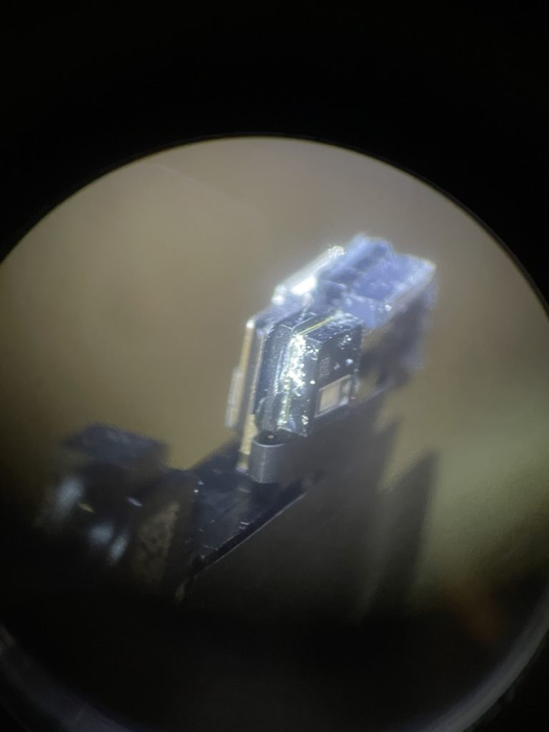 こちらのパーツは故障原因のほとんどが画面上部などから液体が浸入した水濡れによる故障で、今回の端末もセンサー周りに白い腐食が多数見られました。