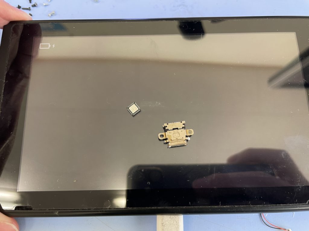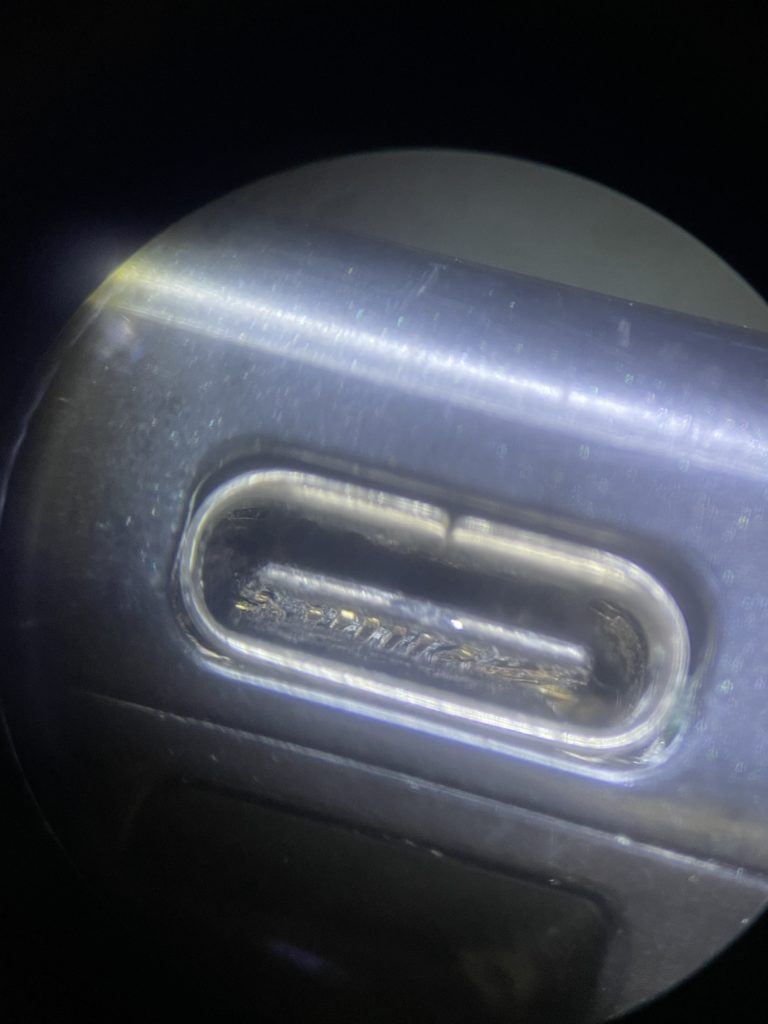 充電コネクターがグラグラしている、コネクター内の端子がこのようにボロボロになっている状態で充電ケーブルを挿し込んでしまうと剥がれた端子同士が接触しメイン基板がショートしてしまう可能性が非常に高いのでご注意下さい。