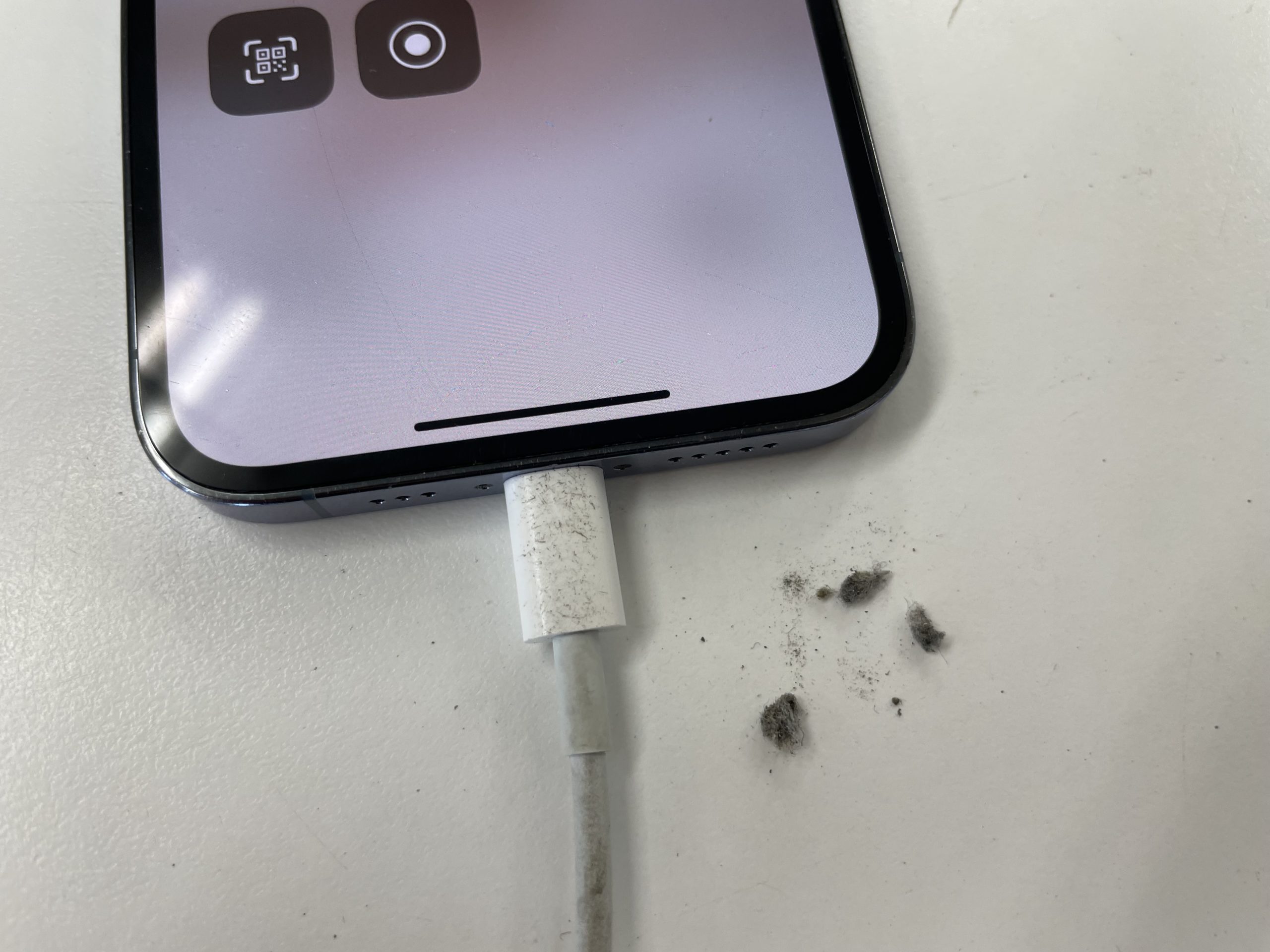 充電の調子が悪いとの事で端末を確認させて頂くと、今回は充電ケーブルを挿し込んだ際に奥に大量のゴミが詰まりしっかり奥まで挿し込めない状態でした。