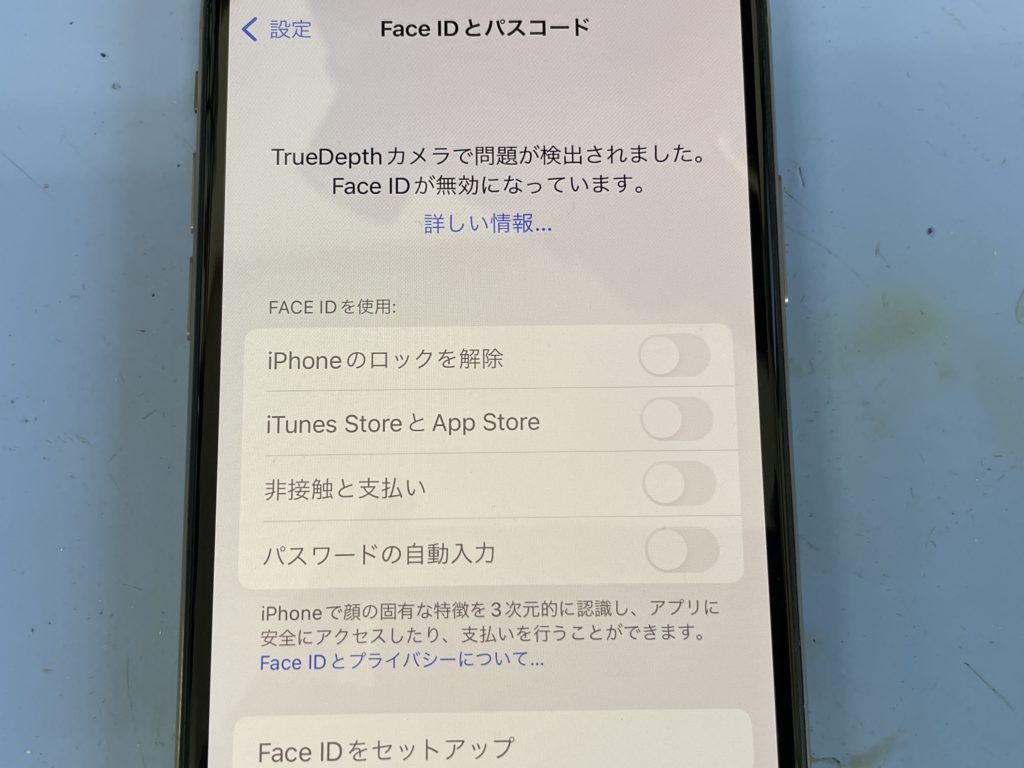 設定画面を確認するとFace ID 問題と表示されており、Face ID登録画面を見るとTrue Depthカメラで問題が~とエラー表示が出ており登録が一切出来ませんでした。