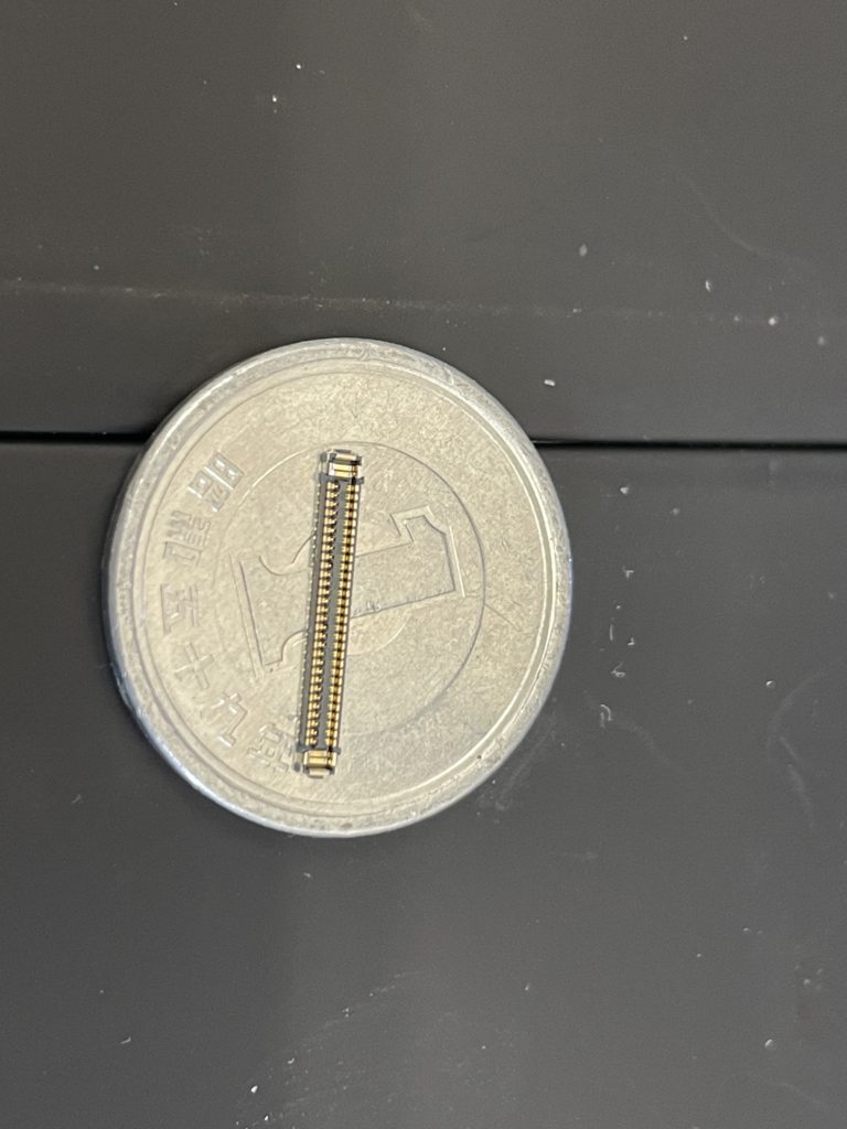 コネクターのサイズは1円玉に載せてこのサイズ感で更に0.01ミリ以下の間隔で計60本の端子を基板に正確に溶接し付ける必要があります。