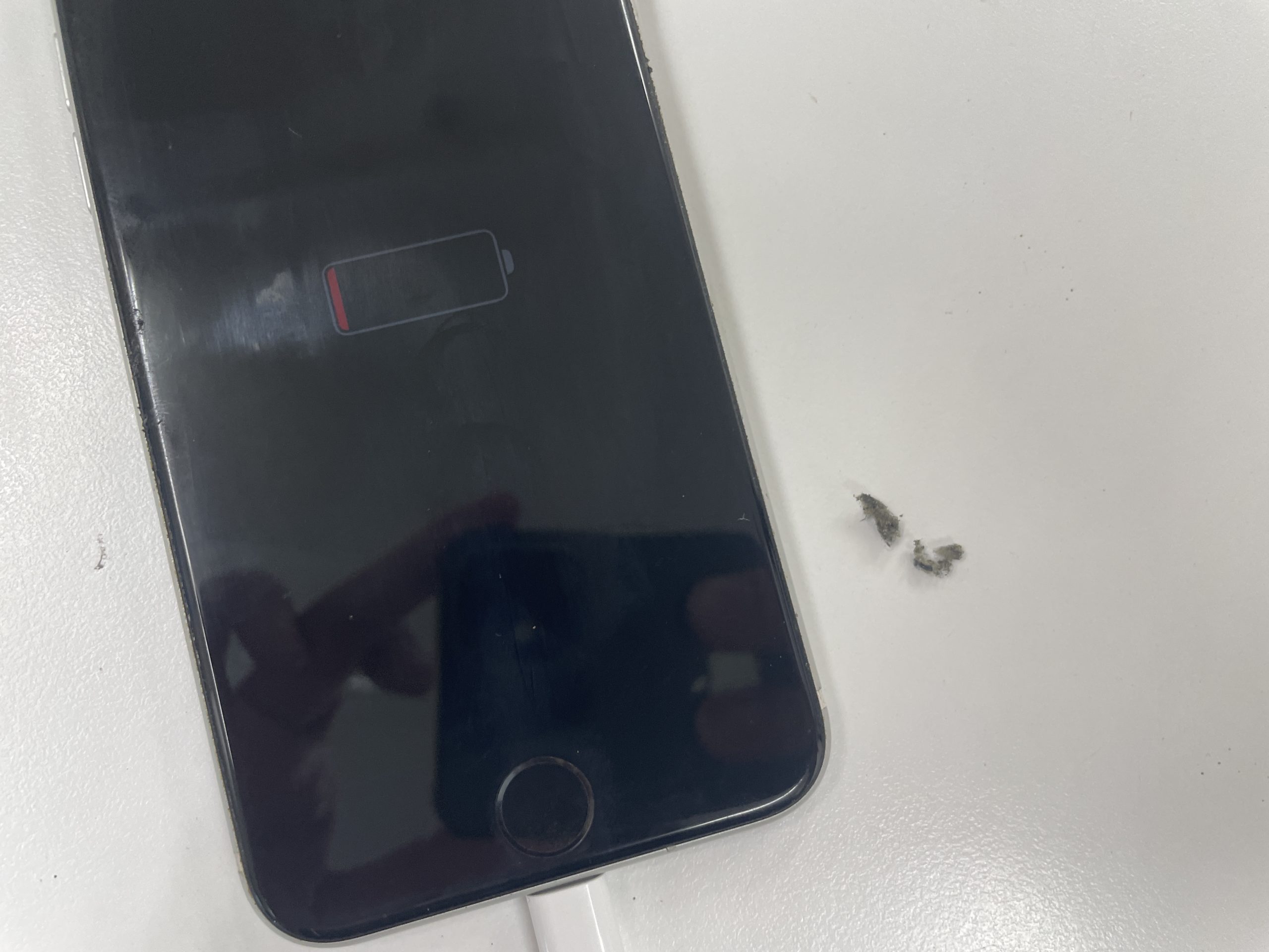 充電が出来ないとの事で端末を確認させて頂くと、今回は充電ケーブルを挿し込んだ際に奥に大量のゴミが詰まりしっかり奥まで挿し込めない状態でした。