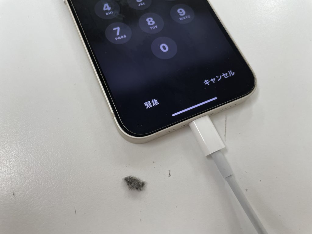 充電が出来ないとの事で端末を確認させて頂くと、今回は充電ケーブルを挿し込んだ際に奥に大量のゴミが詰まりしっかり奥まで挿し込めない状態でした。