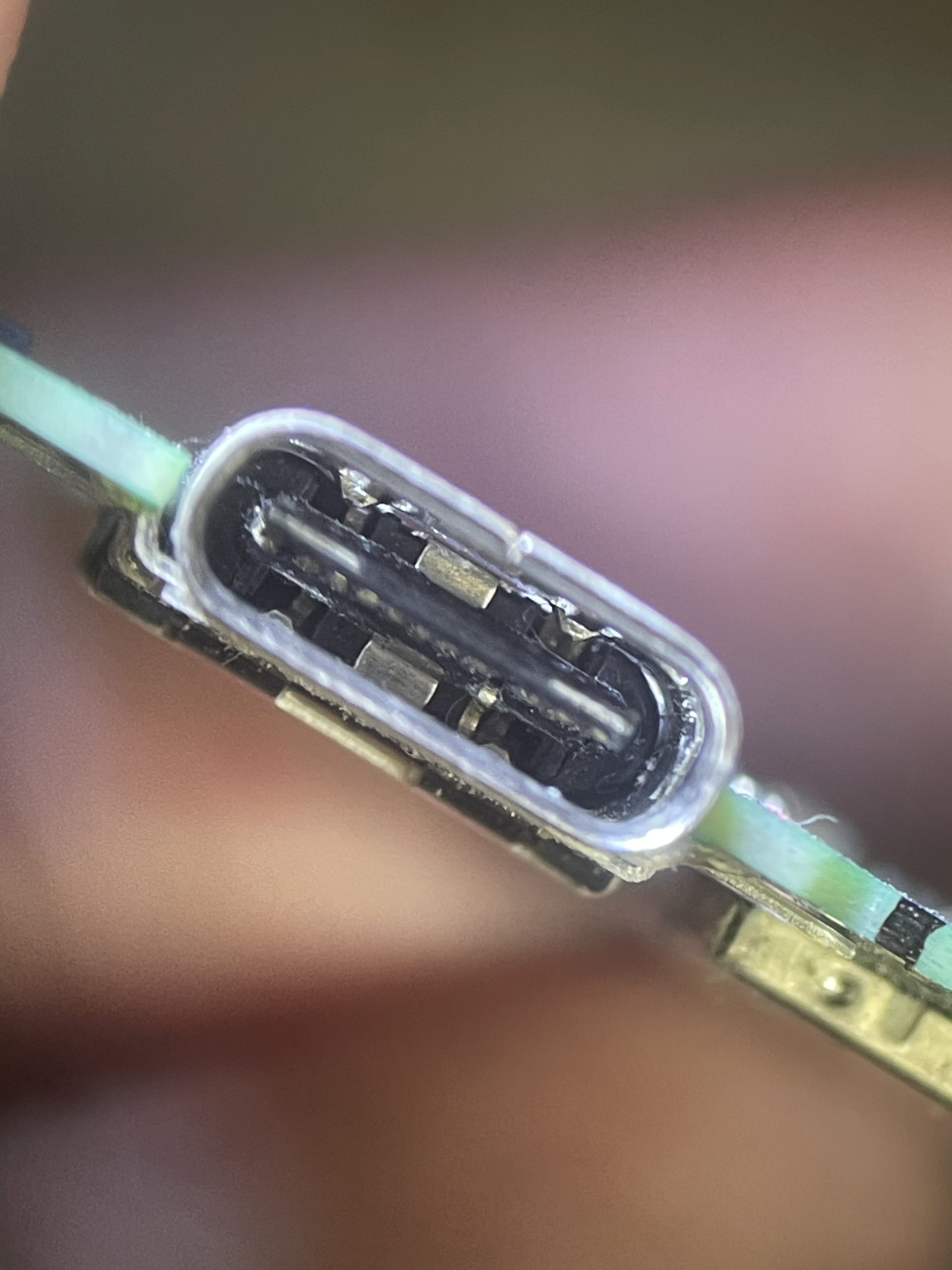 今回のように充電コネクター内の端子が損傷している状態で充電ケーブルを挿し込んでしまうと剥がれた端子同士が接触しメイン基板がショートしてしまう可能性が非常に高いのでご注意下さい。