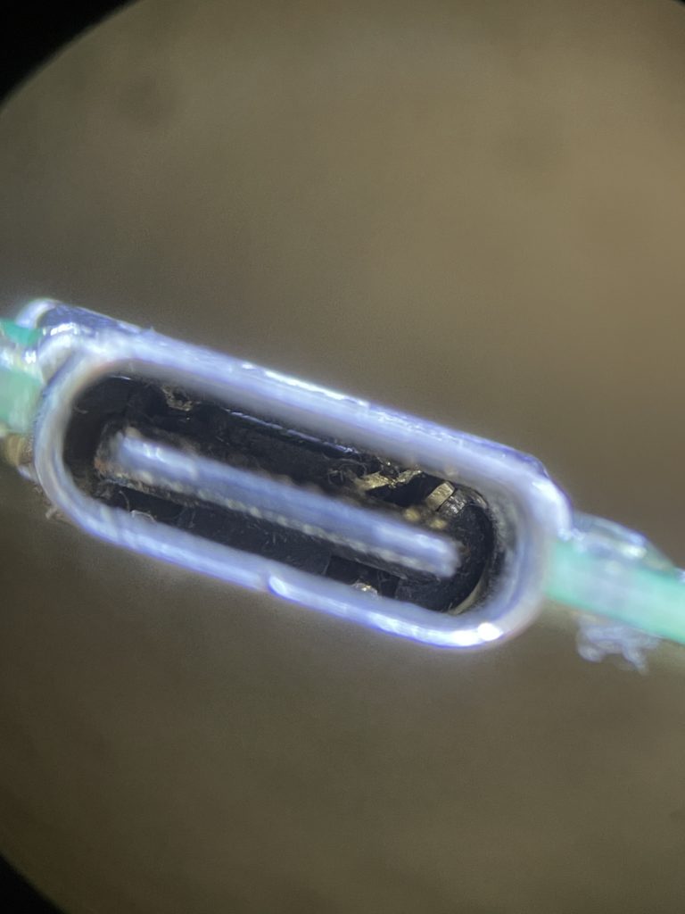 充電コネクターがグラグラしている、コネクター内の端子がこのようにボロボロになっている状態で充電ケーブルを挿し込んでしまうと剥がれた端子同士が接触しメイン基板がショートしてしまう可能性が非常に高いのでご注意下さい。