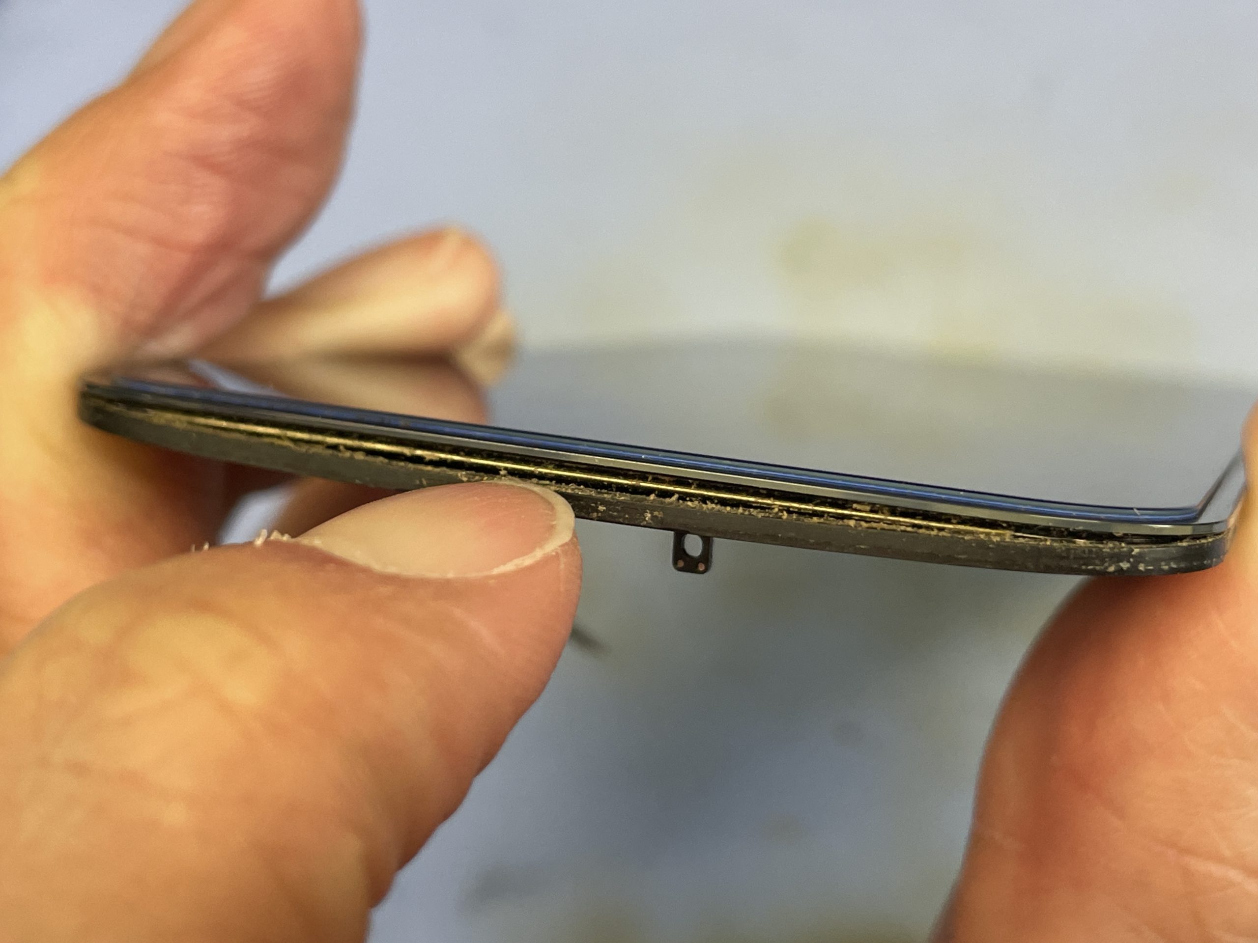 画面浮きの原因はガラスと枠の部分の接着が大部分で剥がれており以前のバッテリー交換の際にダメージを与えてしまっているものと思われます。