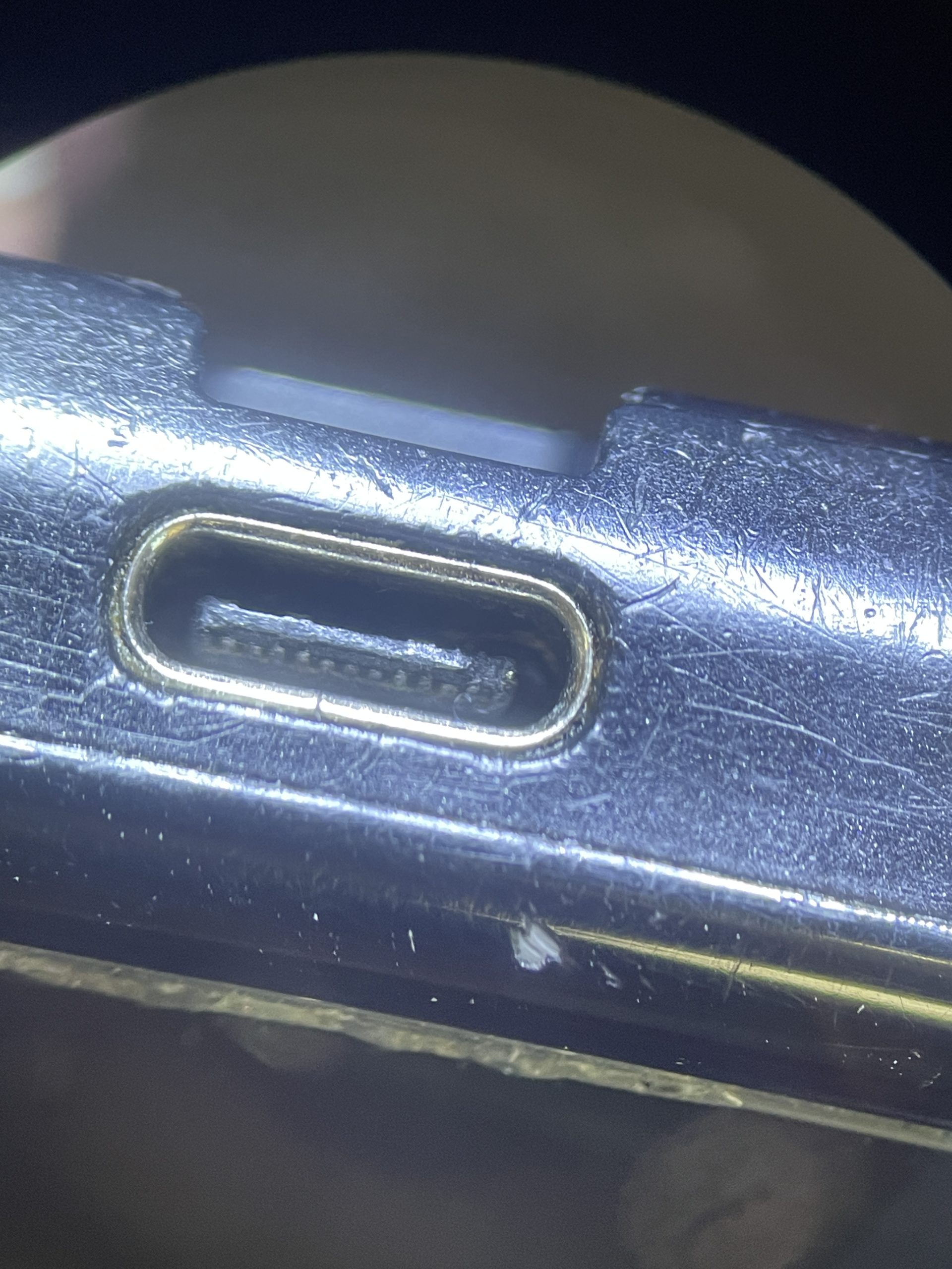 充電コネクターがグラグラしている、コネクター内の端子がこのようにボロボロになっている状態で充電ケーブルを挿し込んでしまうと剥がれた端子同士が接触しメイン基板がショートしてしまう可能性が非常に高いのでご注意下さい。