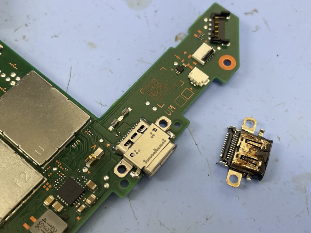 Switchは受付時に充電コネクターを確認すると端が欠けて損傷しておりましたのでまずは充電コネクターを新しいものに交換します。