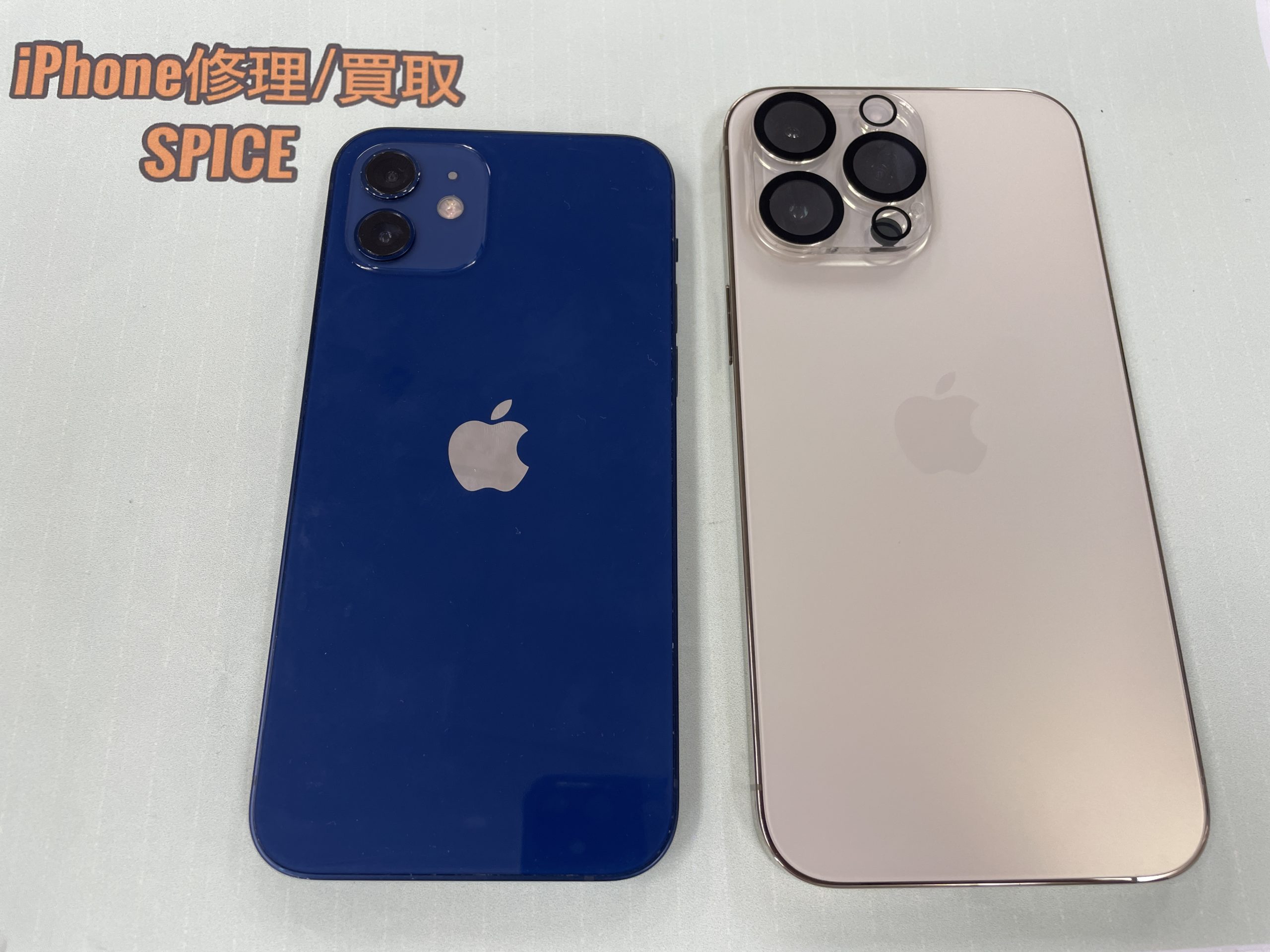 iPhone12は本体に目立つ傷が多数、バッテリーも劣化している状態、14Pro Maxは基板故障で起動しない状態ですが2台とも問題なく買取成立です。