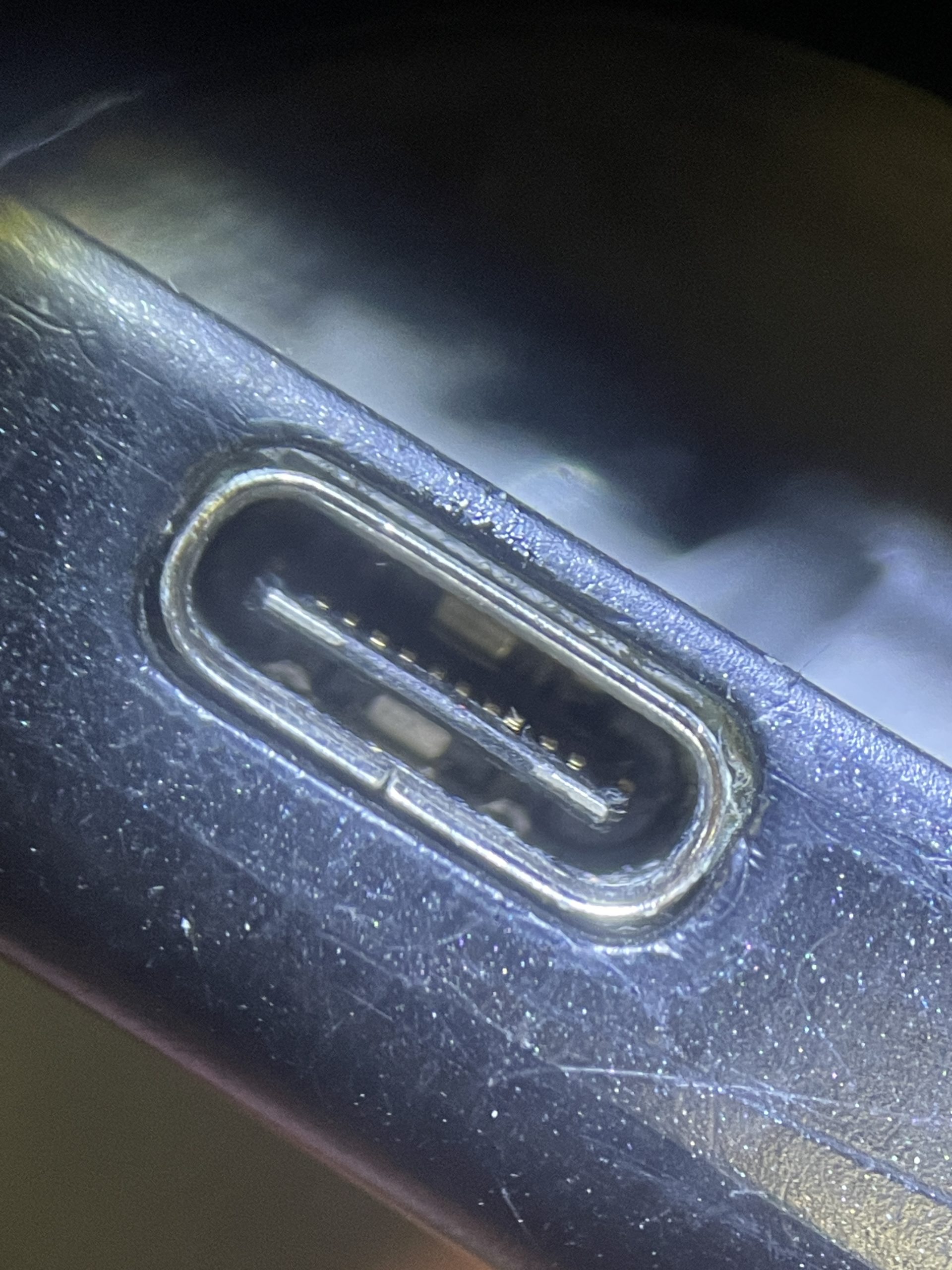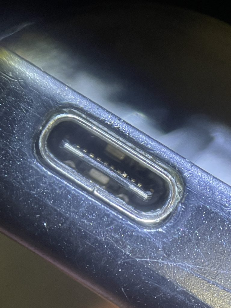 受付時に端末の確認を行うと充電コネクター内部が損傷し両サイドの端子が折れて変形、片面の端子が土台からほぼ全て浮いている状態でした。
