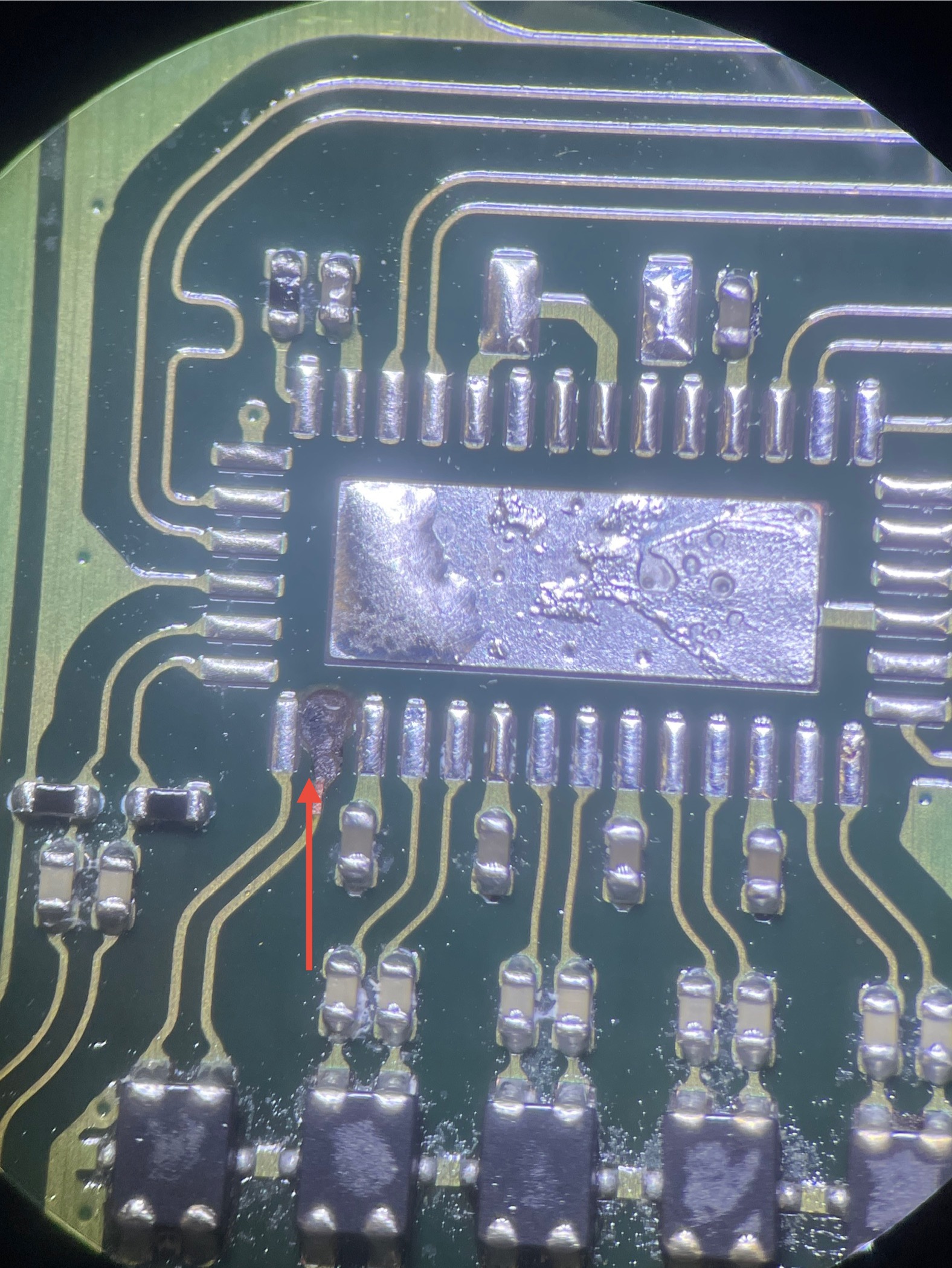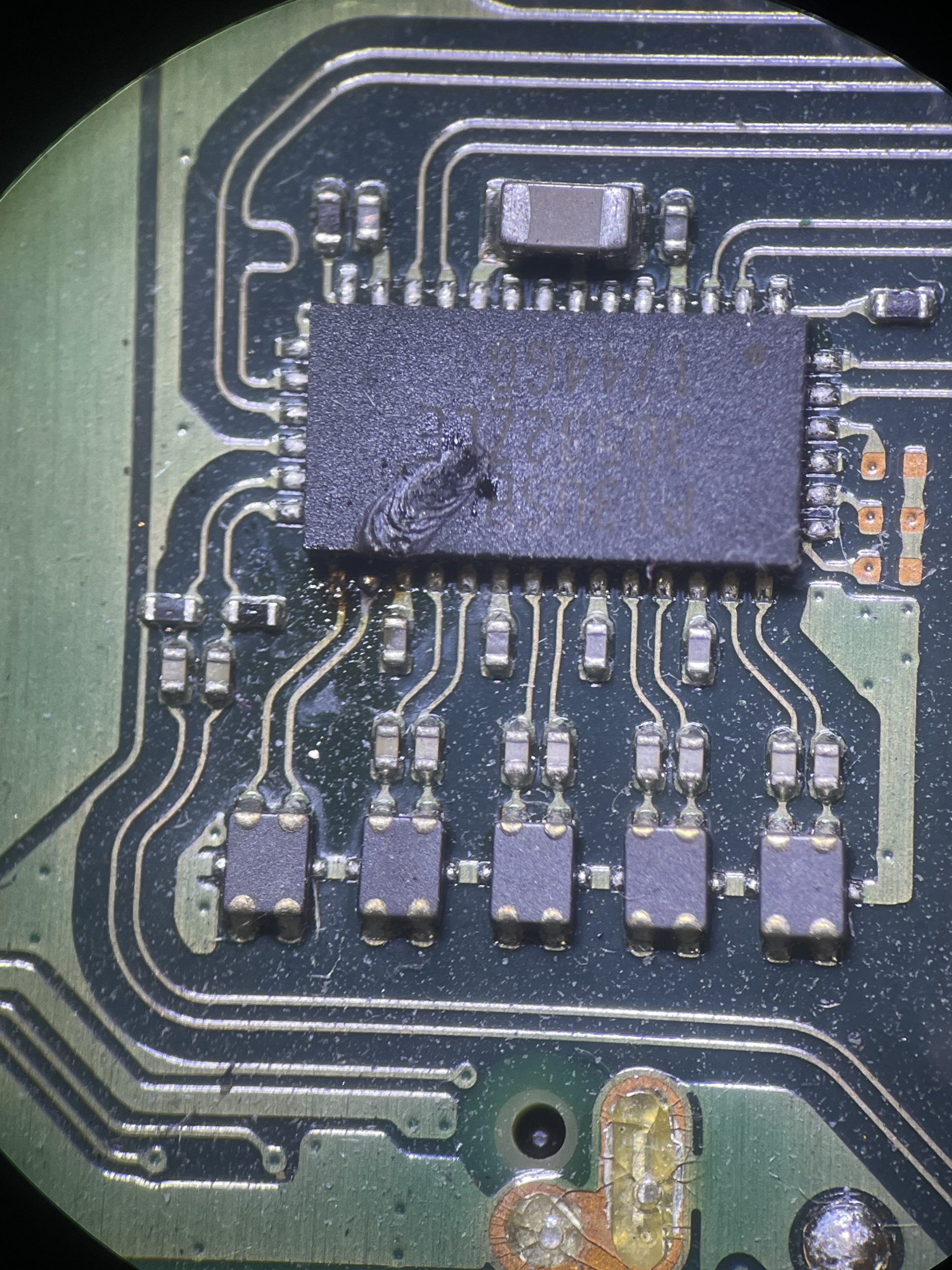ICチップを取り外してみると半田が乗る接点も焼け切れておりこのままでは新しいICチップの取り付けが出来ませんので無くなってしまった接点も細いワイヤーを使用し修復します。