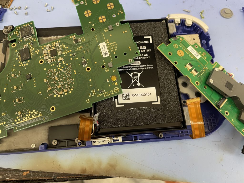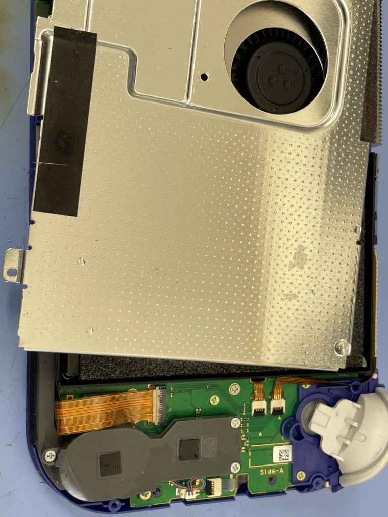 受付時に動作確認を行うとなぜかLボタンを押すと画面がスリープされてしまう症状があり一旦内部クリーニングをご希望だったこともあり分解し作業を行います。