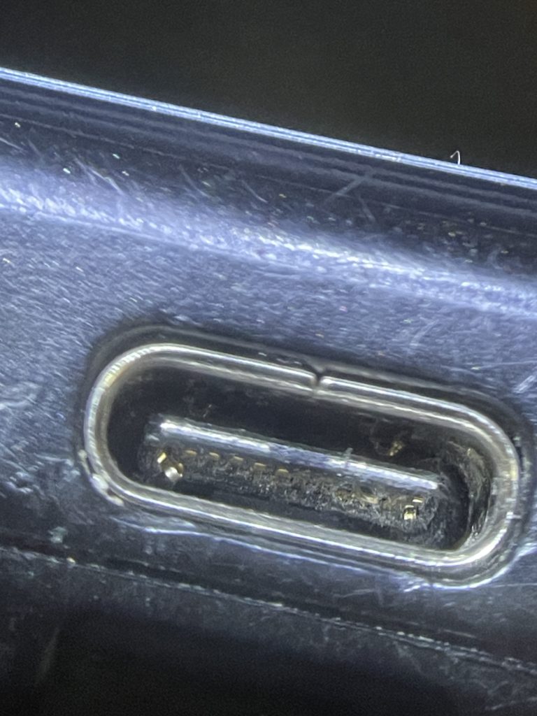充電コネクターがグラグラしている、コネクター内の端子がこのようにボロボロになっている状態で充電ケーブルを挿し込んでしまうと剥がれた端子同士が接触しメイン基板がショートしてしまう可能性が非常に高いのでご注意下さい。