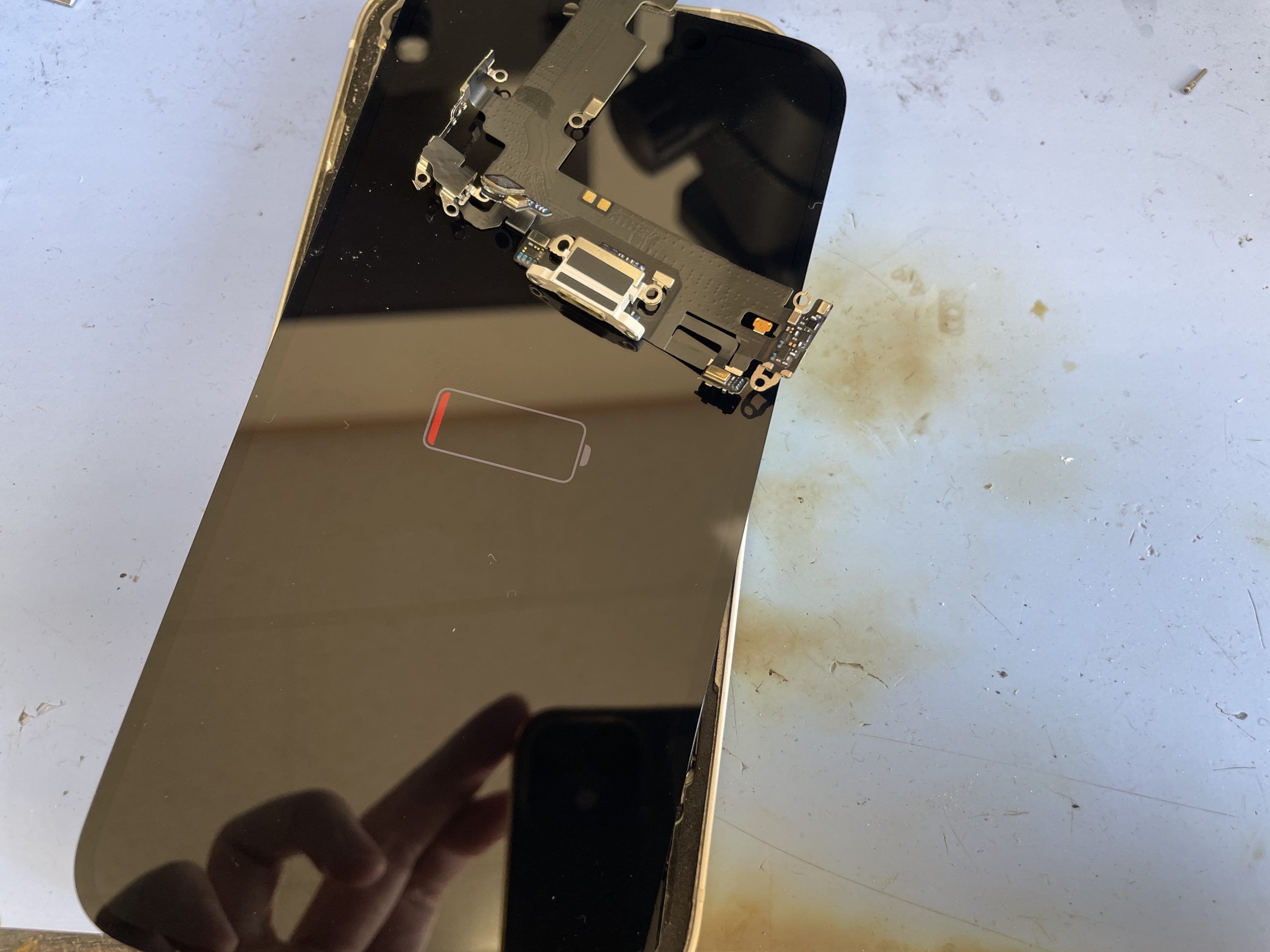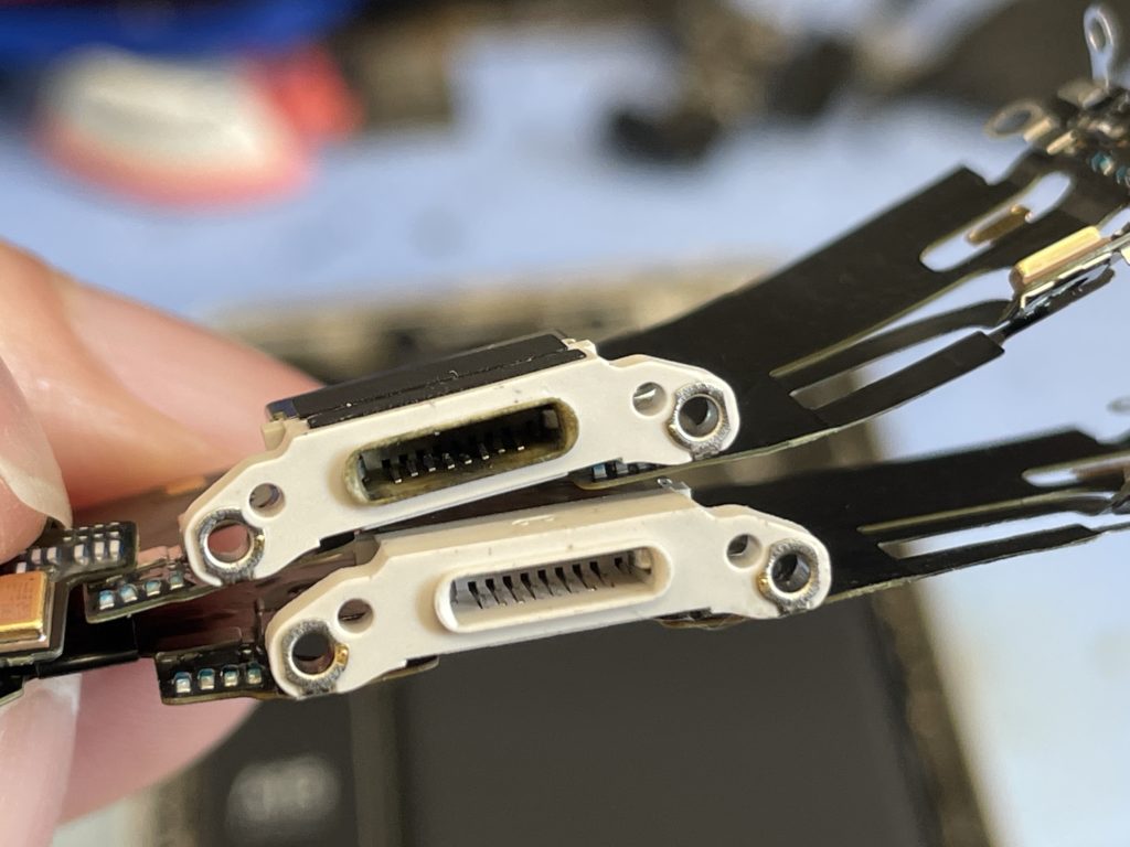 以前から充電の調子が悪かったようですが受付時に充電コネクター内を確認すると特に埃などが詰まっている訳でもなくワイヤレスでの充電を行うと充電中の表示がされる事から充電コネクターが故障している可能性が高いです。