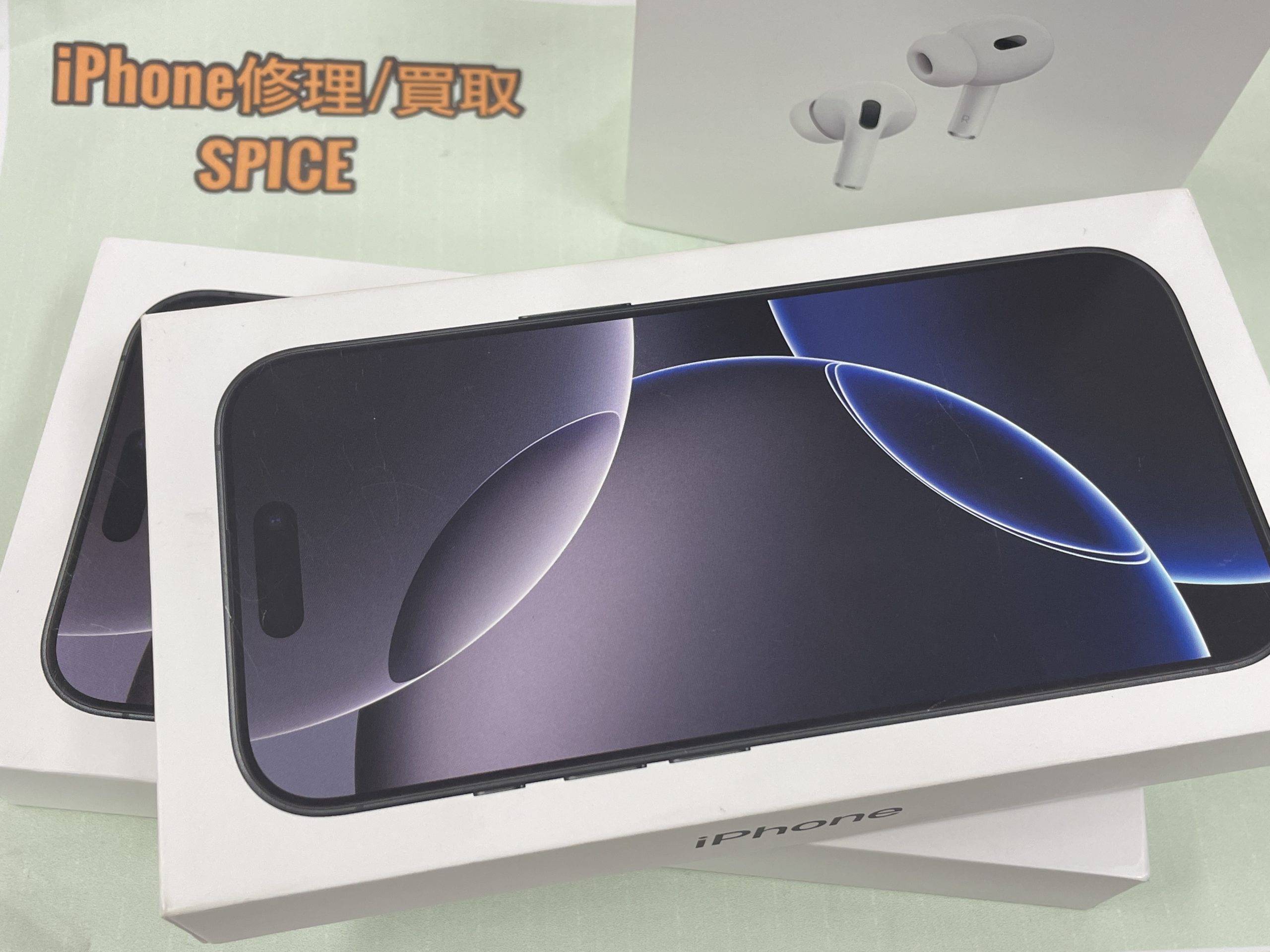 以前も買取でご利用頂いたお客様で最新のiPhone16Proが1台、16Pro Maxが1台、Airpods Proが1台と3台まとめて買取成立です。