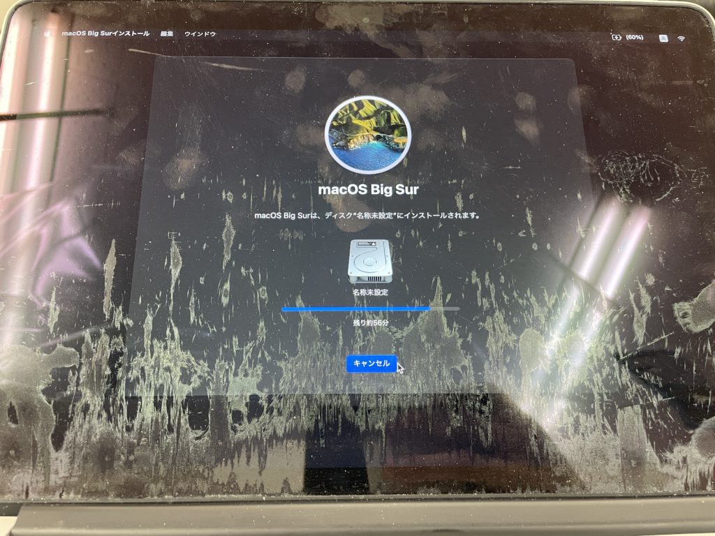 Macbookは液晶のコーティングが激しく劣化し画面状態が非常に悪いものの初期化を行い買取成立です。