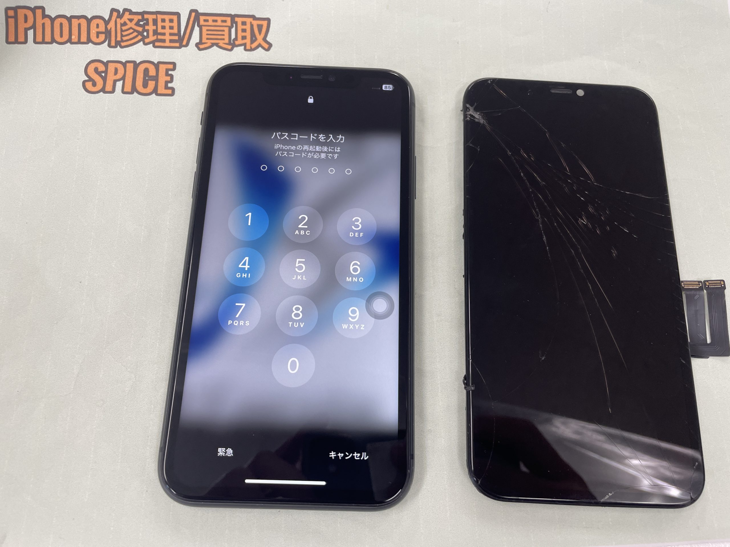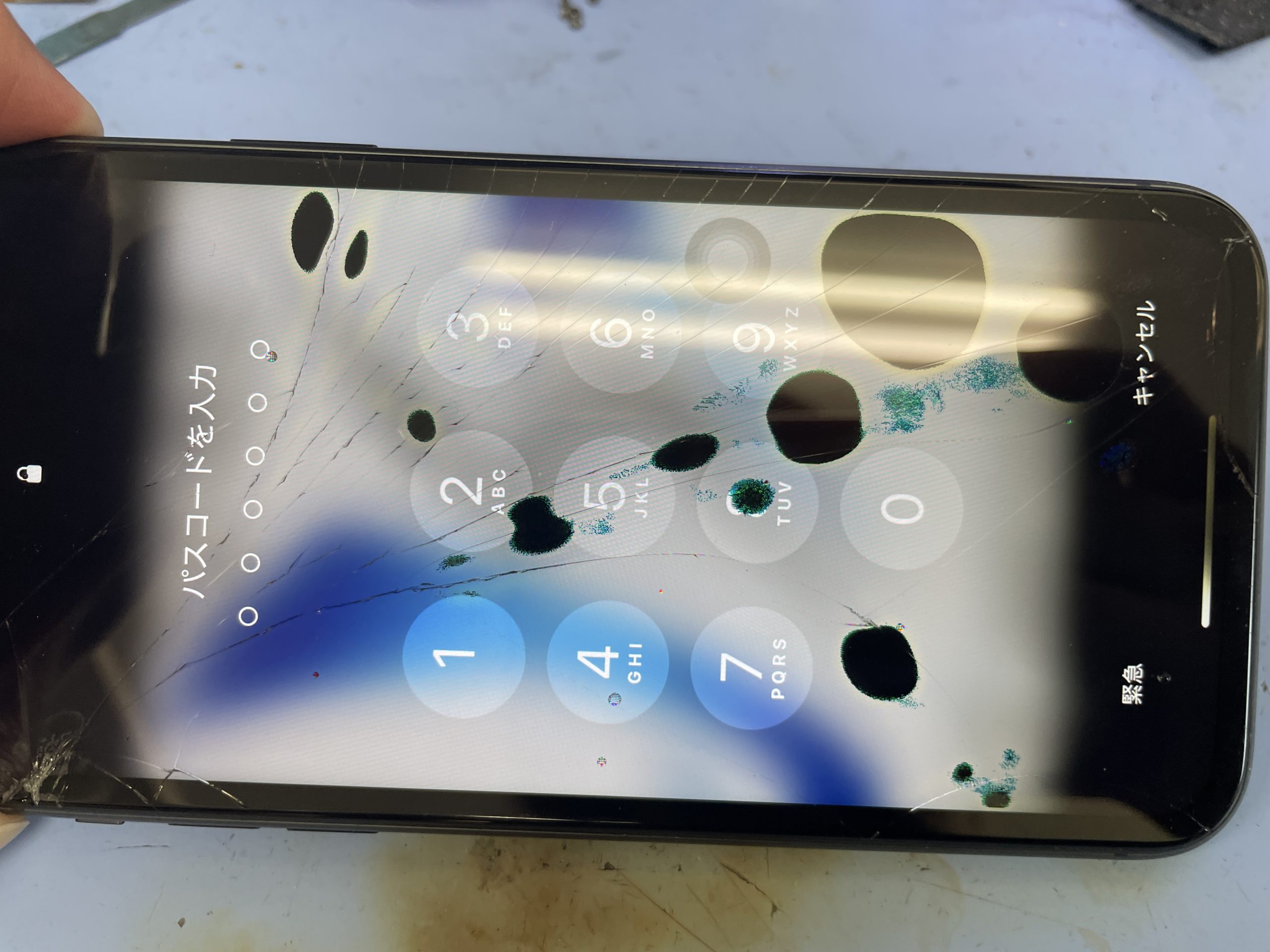 加古川市よりiPhone11 ガラス割れにより液晶漏れで黒くなっている部分が多数ありましたが15分程で元通り修理完了です。