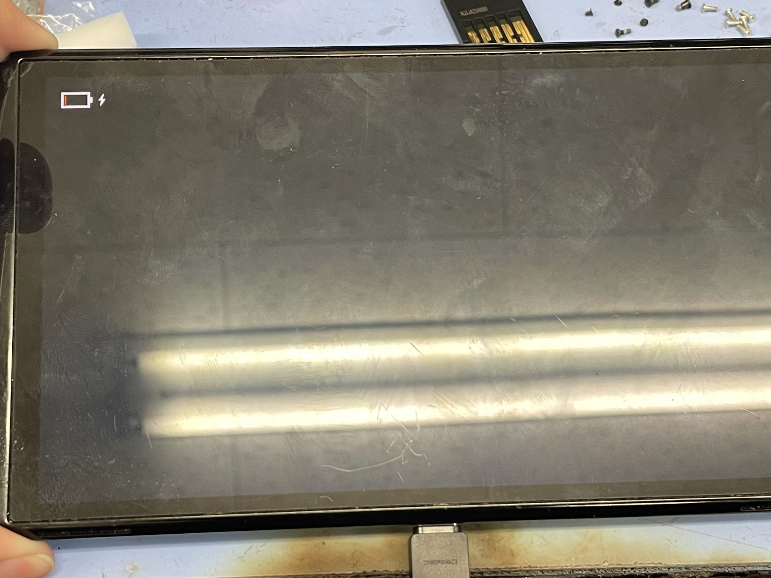 修理作業後に一通り組み戻し充電を行うと充電マークが表示され10分程すると問題なく起動し動作も問題ありません。