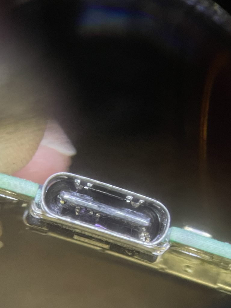 充電コネクターがグラグラしている、コネクター内の端子がこのようにボロボロになっている状態で充電ケーブルを挿し込んでしまうと剥がれた端子同士が接触しメイン基板がショートしてしまう可能性が非常に高いのでご注意下さい。