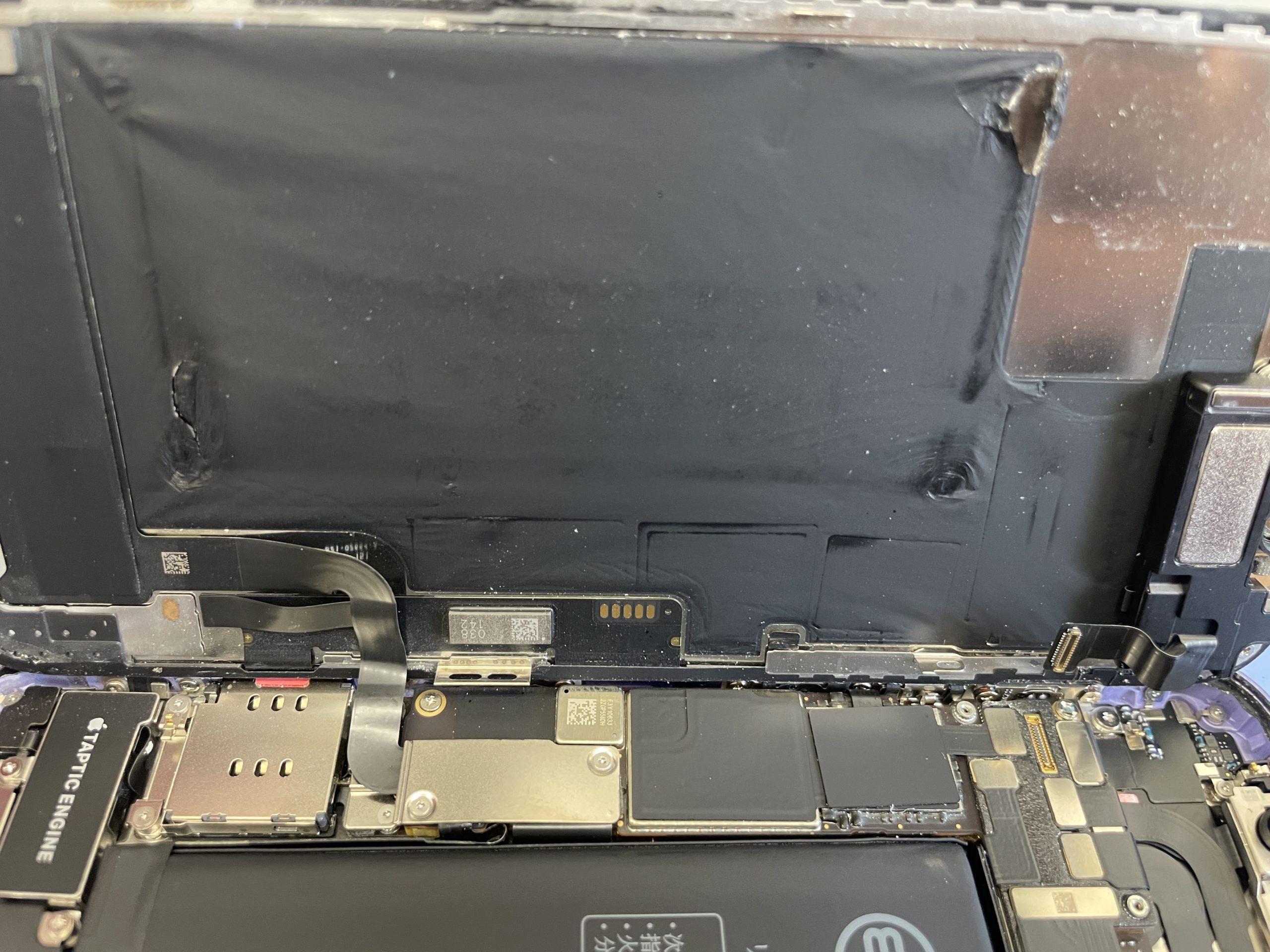 画面の一部も以前から黒く液漏れしたような状態で使用されていたそうですがサブ端末という事もありその部分は修理せず起動出来るようにまで復旧させます。