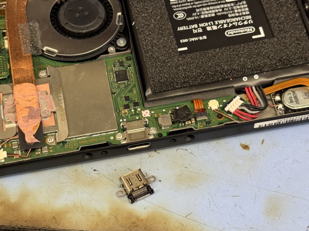 Switchのコネクター修理は基板に実装されており難しい作業となりますが当店では1時間程で交換可能です。