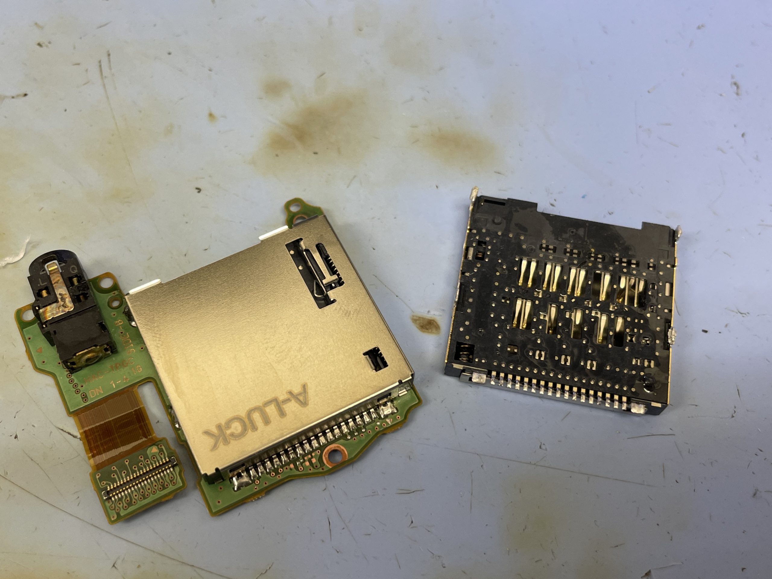 受付時にカセットスロット内を確認すると内部端子が複数本曲がっているのが確認出来ましたので早速分解し破損したカセットリーダーを取り外し新しいリーダーに交換します。